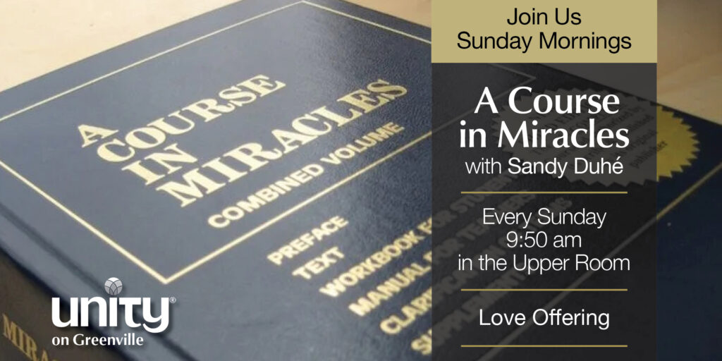 Join us Sunday Mornings at 9:50 am in the Upper Room for A Course in Miracles facilitated by Sandy Duhé